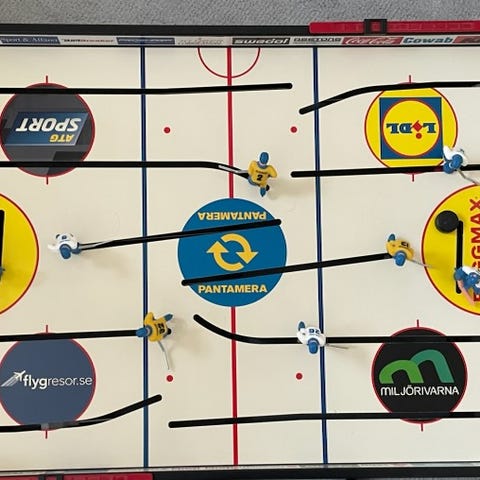 Retro ishockeyspel i bordsspelmodell med spelare i blå och gula färger. Spelet har en spelplan med olika sponsormärken och ett nät runt målen. Passar för inomhusbruk och är utformat för två spelare.