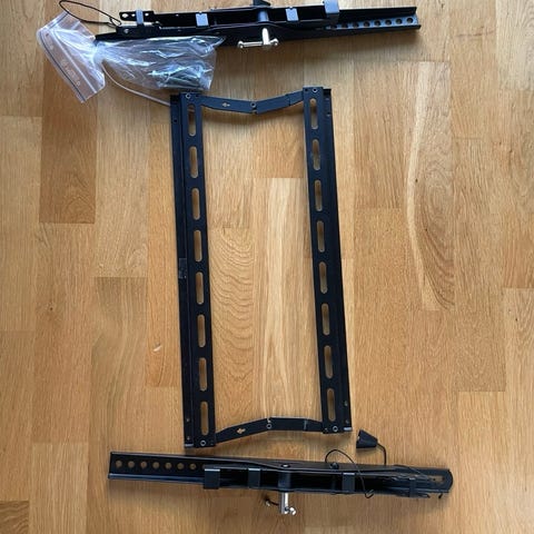 Vi har haft en 55”. Går möjligen ett antal storlekar till. Fästet får TVn snyggt och enkelt monterad nära väggen. Nypris 500kr. Utförande enligt bild.