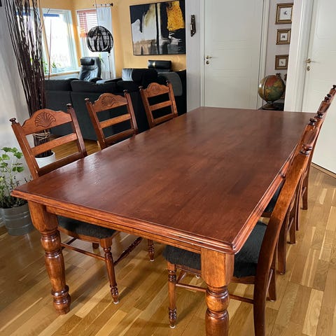 Borbonne massiv ek. Matgrupp bestående av matbord med iläggsskiva och sex stolar i brunt trä. Bordet har rektangulär bordsskiva med möjlighet att förlänga med separat iläggsskiva. Stolarna har träsits och ryggstöd med horisontella ribbor. Passar som matplats i kök eller vardagsrum och ger en enhetlig trästil i rummet. Några stolar har renoveringsbehov då limmet släppt.