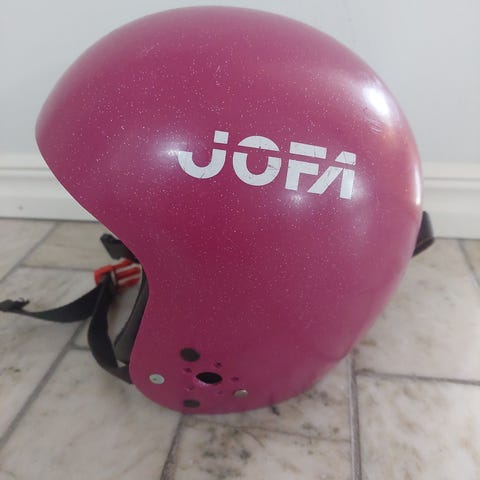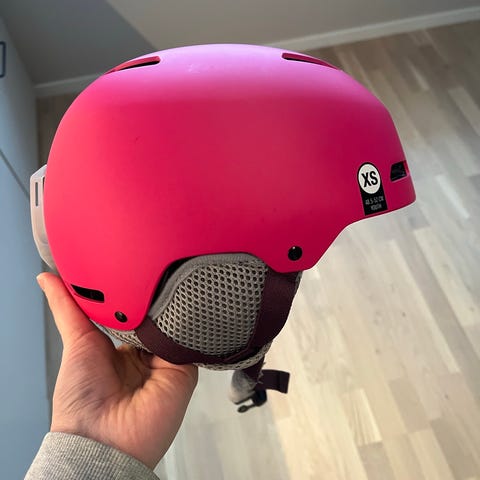 En rosa skidhjälm med varmt, mjukt foder. Hjälmen är justerbar i nacken och endast använd av ett barn. Storlek 51/53.