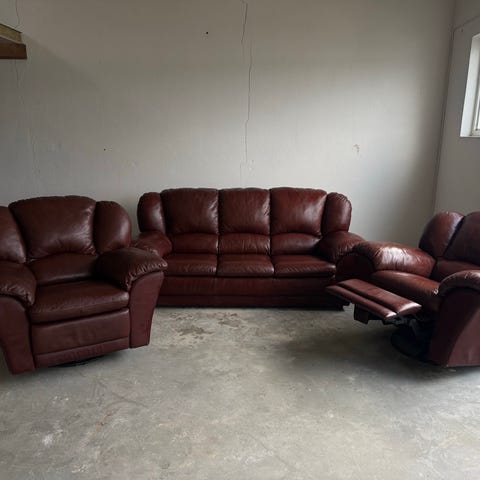En fin och lyxig soffgrupp i äkta läder tillverkad i England. Se bifogad bild för ytterligare information om sofforna och lädret. Sofforna är i gott skick med ytterst lite slitage på något ställe, dock inget som stör. Fullt fungerande och bekväma.