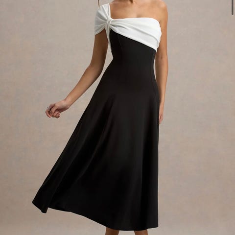 -/cocktailklänning i storlek M, flerfärgad och tillverkad i polyester. Klänningen är avsedd för kvinnor och har en kombination av svart och vitt med detaljer som volang och rosett vid halsen.