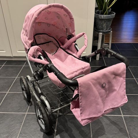 BRIO dockvagn i rosa färg. Tillverkad med metallram och textilklädsel. Utrustad med fyra hjul och justerbart handtag. Lämplig för barn som leksak för dockor. Vagnen är i princip inte använd men tyvärr har handtaget lite skav, går att ta bort om man vill. Nypris runt 1000 lappen