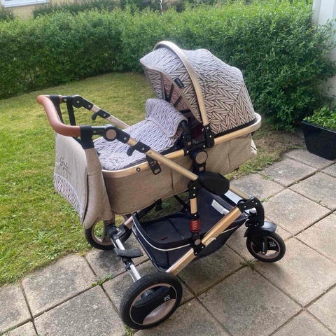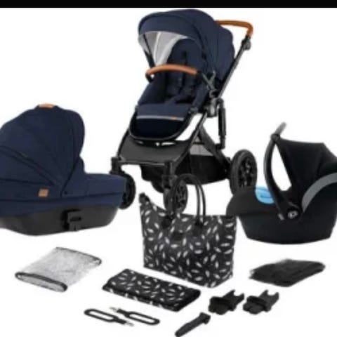 Crescent barnvagnsset som inkluderar en sittvagn, liggdel och babysitter. Alla delar är i grått tyg med detaljer i läderimitation på handtag. Barnvagnen har stora hjul för stabil körning och justerbart handtag. Babysittern är mjukt vadderad med säkerhetssele. Passar för barn i olika åldrar och användningsområden. Adapter för Maxicosi bilstol ingår!