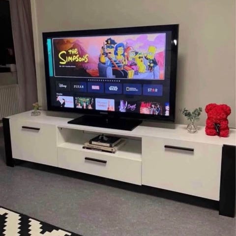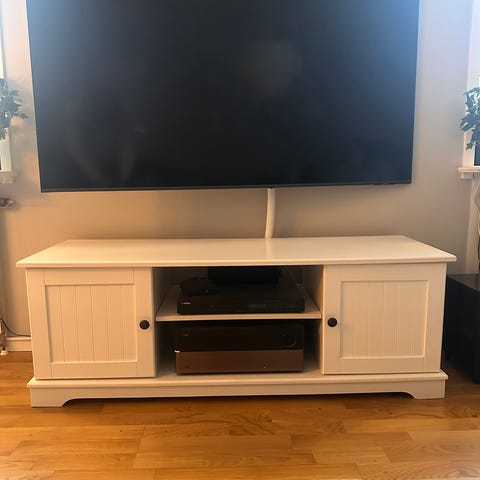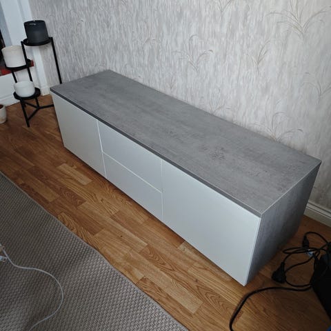 Svart tv bänk som inte används längre, den är lite sliten uppifrån som ni ser på bilden men det är inget som man märker mycket. Höjd 38cm