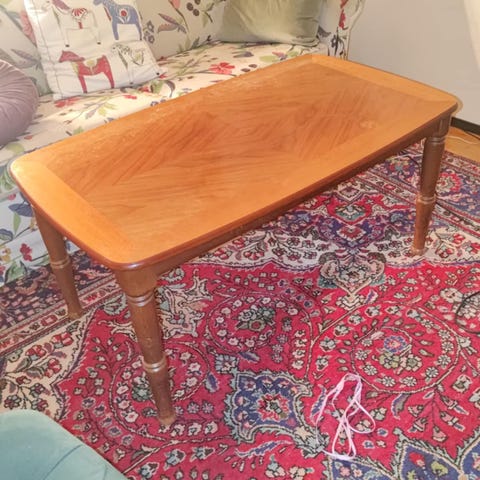 Bordet har använts som soffbord men det fungerar lika väl att ha den i sovrumet som avlastningsyta. Den är väl använd och har små, synliga defekter, se bilderna.