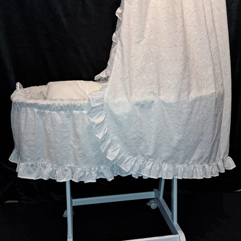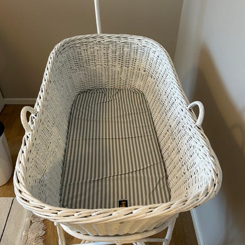Vacker korgsäng med sänghimmel. Inköpt 1986. Använd till ett barn. Lite avskavd färg. Säljes i befintligt skick. Hämtas i Vallentuna.