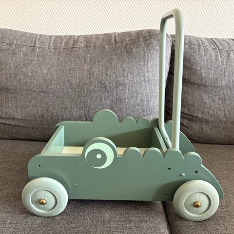 En fantastiskt fin leksaksbil i trä. Som ett ägg på hjul som kan rulla åka. Perfekt som lära-gå-vagn. Limiterad 21 av totalt 30 exemplar. Design Carl Malmsten 5+5 DESIGN gruppen. Snickeri och formgivning på Malmstens CTD 2005. Kan åka på den, sitta på den. Skjutsa kompisen eller lillasyster småsyskon. Bra med förvaring. Öppna och upptäck. Båda sittdelarna locken är öppningsbara. Fin som inredning på barnrum.