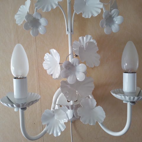 Vägglampa med två lampor och vit sladd med äldre kontakt. Lampan har en dekorativ design och är avsedd för väggmontering. Glödlampor ingår ej. Hämtas eller skickas.