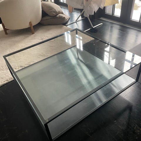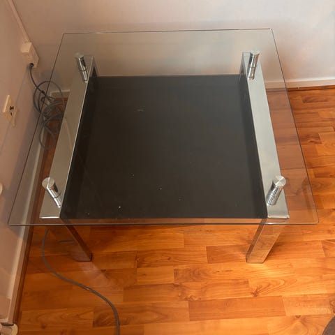 Säljer ett stilrent och modernt soffbord i glas med svart metallram.