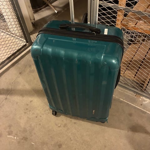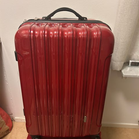 Stor resväska på hjul som hängt med i många år, men har många år av resande kvar i sig.