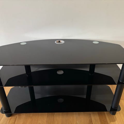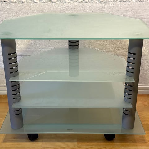 Två stycken sidobord/tv-möbler säljes. Ram i rostfritt stål och tre hyllplan i rökfärgat glas.