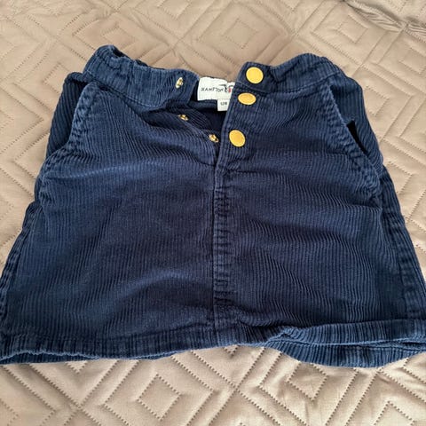 H&M L.O.G.G. flickklänning i storlek 128, tillverkad i blått manchestertyg. Klänningen har hängslen och är anpassad för barn.