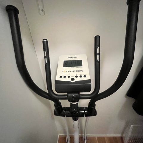 Masterfit Crosstrainer träningsmaskin i svart och grå färg. Utrustad med digital display för att visa träningsdata. Används för konditions- och styrketräning hemma.