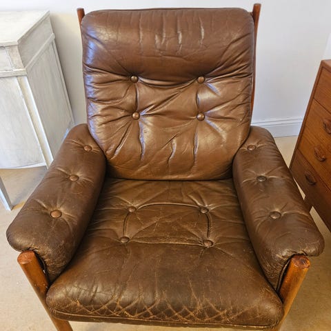 Retro svart skinnfåtölj med träinslag på ben och armstöd