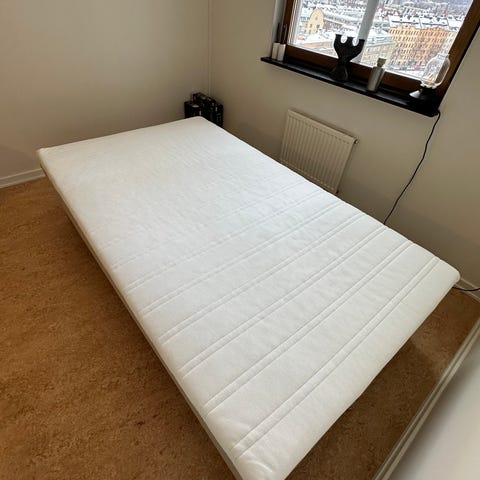 IKEA sängmadrass säljes inklusive bäddmadrass. Sängkappa medföljer i vitt. Nyskick och utan fläckar. 120 cm i bredd.