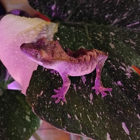 Inrett terrarie med värmelampa och automatisk programerbart vattenspray system ingår (Monsoon Solo II). Ett av glasluckorna har en lite skärva gått av, men inget som geckon kan skada sig på. Armatur för UV-lampa finns men ingen lampa.