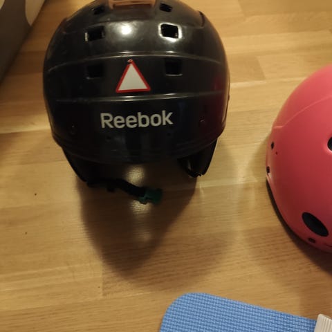 Två Jofa ishockeyhjälm i svart färg. Hjälmen har ventilationshål för luftgenomströmning. Den är utrustad med justerbara remmar för säker passform och skydd av huvudet vid ishockeyspel.