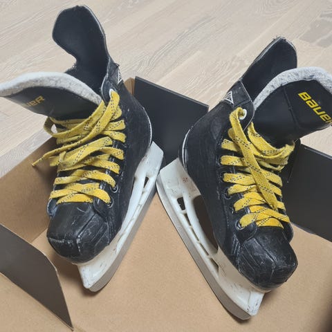Bauer barnskridskor i storlek 33, avsedda för ishockey. Skridskorna är svarta med vita snören och detaljer i gult. De är designade för barn och har en konstruktion som passar för ishockeyspel.