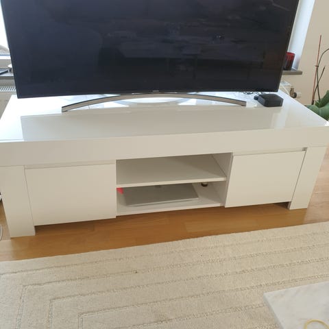 Vit Tv- bänk, hyllplan saknas.