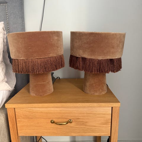 Fina bordslampor med lampskärmar i blå sammet säljes. Upphämtning på Kungsholmen. Höjd 45 cm