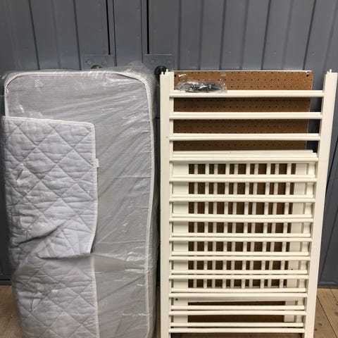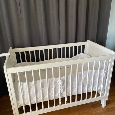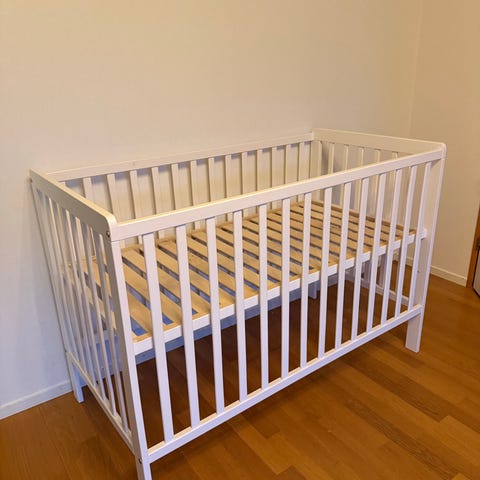 Spjälsäng i vitt. Kantskydd och madrass medföljer. Madrassen har en skada undertill men inget som påverkar funktionen.