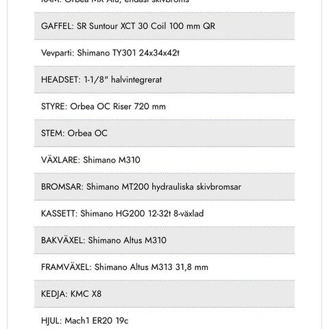 Orbea MX Alloy mountainbike med 29" hjulstorlek och ramstorlek M, avsedd för unisex. Utrustad med SR Suntour XCT 30 Coil 100mm framgaffel, Shimano Altus M310 komponenter inklusive framväxel, vevparti, växlar och kassett med 8 växlar. Bromsar är Shimano MT200 hydrauliska skivbromsar. Styre är Orbea OC Riser 720mm, sadel Selle Royal 2073 och sadelstolpe Orbea