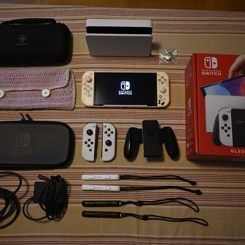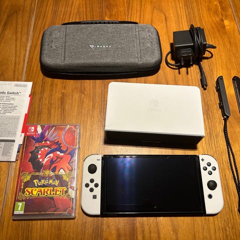 Nintendo Switch Zelda Special Edition med Joy-Con i specialdesignad färg och motiv från Zelda-serien. Konsolen inkluderar en bärväska och originalförpackning med Zelda-tema.