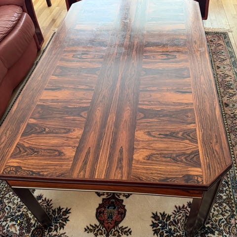 Säljer mitt fina soffbord i retrodesign med snygga detaljer på skivan och fötterna. CITES intyg från Jordbruksverket finns och medföljer vid ägarbyten. Mått 107x51 cm. Pris 2500 kr. Hämtas på Karlaplan.