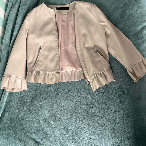 Mörkgrön jacka i nappa med knäppning framtill och dekorativa detaljer. Jackan har en krage och två fickor fram. Fodrad med ett mönstrat tyg. Knäppningen syns på bilden och jag tror kan inte avgöra om det är herr eller dam men tror det är dam. Märkt st 42.