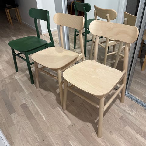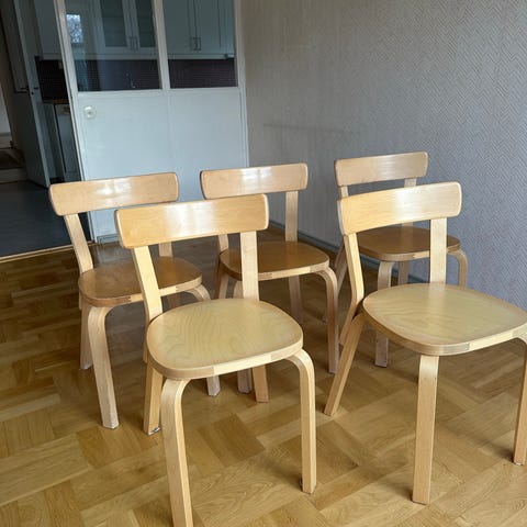 Fyra stolar, modell Chair 69, design Alvar Aalto för Artek. Tillverkade i trä. Klassisk och tidlös design.