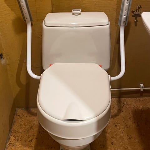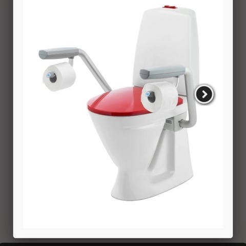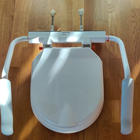 Säljer en Etac Hi-Loo toalettsitsförhöjare (ca6-7cm) med fast montering och armstöd, ingått i huset jag renoverar. Men i bra skick.