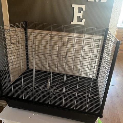 Set med bur och olika tillbehör för smådjur inklusive bur i metall med trädetaljer, 2 transportburar i plast med handtag, leksaker och mat- och vattenskålar i keramik följer med två stycken . Passar för små husdjur som kaniner, hamstrar eller liknande.
