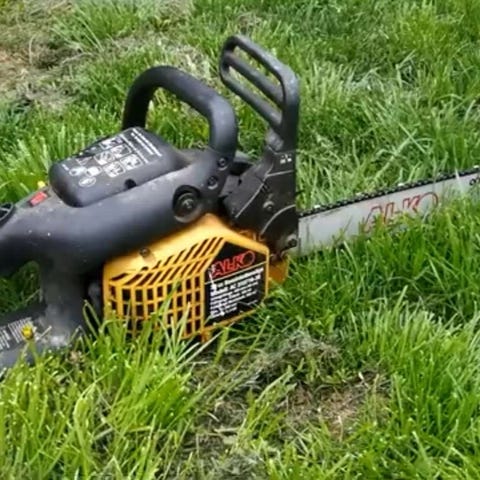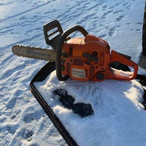 Husqvarna 435 X-torq motorsåg som levereras med justerskruvmejsel för förgasare och bruksanvisning.