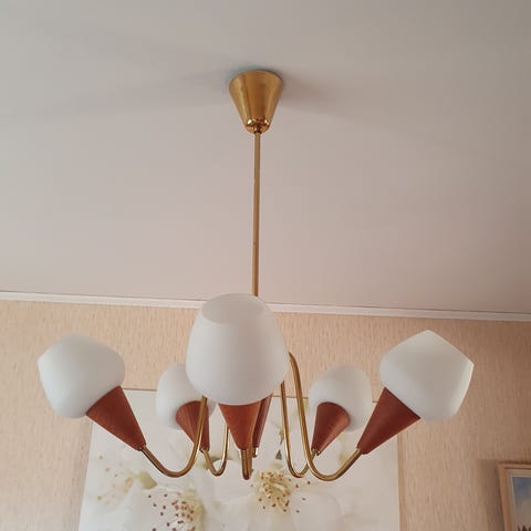 Teak och mässing, alla delar är original utom skärmarna somt nya och fräscha, off-white färg.