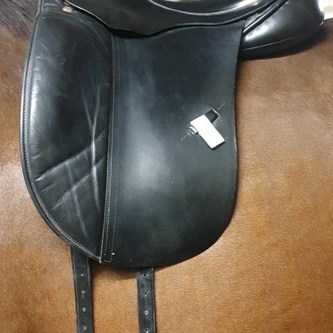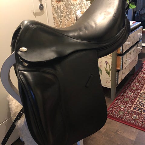 En äldre kvalitetssadel som ligger bra på många hästar. Kräver ett halvtydligt och stabilt sadelläge med vidd i fram, ganska rak rygg. Har tyvärr inte koll på bom men den är vidare än normal. Sätet är nog ca 16,5.