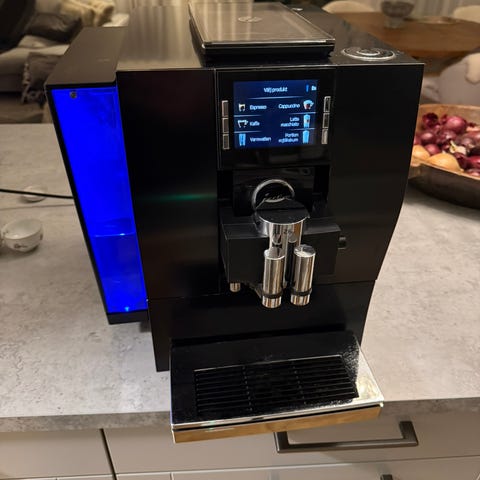 Kaffemaskin från Jura, modell GIGA X8c. Brygger väldigt gott kaffe. Har stått på ett kontor och service har utförts av Kaffegreven varje år. Vi har aldrig kört mjölk i den, men det går att koppla mjölkbehållare till den (extrautrustning som går beställa). Två behållare för bönor så man kan ha espresso och kaffe. Maskinen är drygt 8 år. Kan skickas , men väger 27kg så jag ser hellre att vi löser en avlämning eller hämtning i Göteborgs området. Nypris ca 85000kr