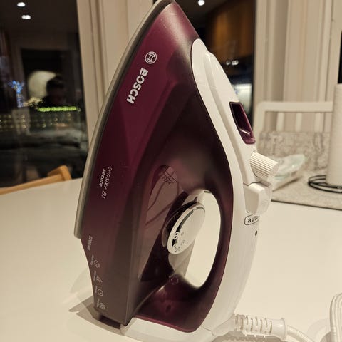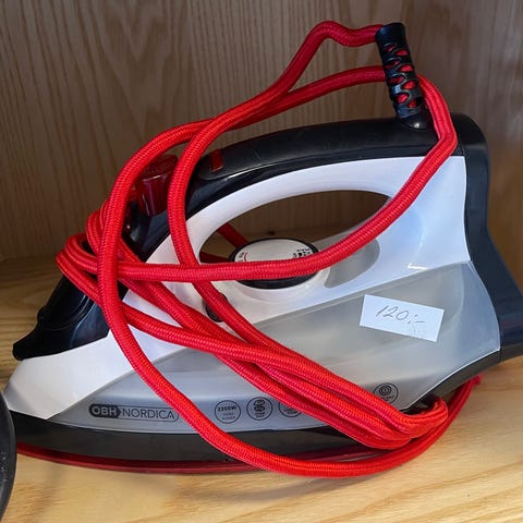 OBH Nordica strykjärn med röd och vit färg. Strykjärnet har flera reglage för justering av temperatur och ånga.