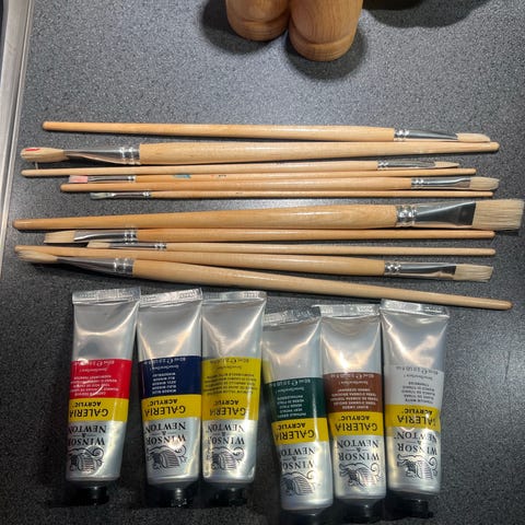 Färg; alkyd och olja. Påbörjade men helt ok.