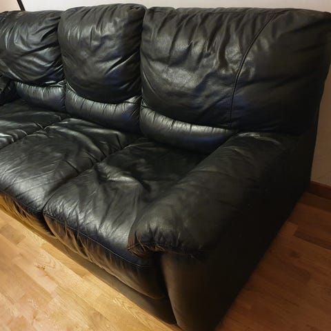 Äkta skinnsoffa mörkbrun med SOM'TOILE bäddsoffa. Mycket enkel att dra ut framåt. Helt ny madrass aldrig använd. Skinnet kan behandlas. Lite skav på ena sittdynan. Hämtas av köparen.