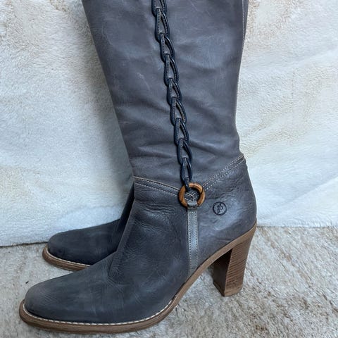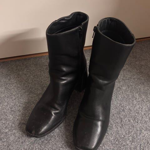 Stövlar i storlek 39 tillverkade i svart läder. Modellen har dragkedja på insidan och en klack med måttlig höjd. Sulan är slät med ett mönster på klacken för bättre grepp. Väl omhändertagen inga synbara eller kännbara förslitningar
