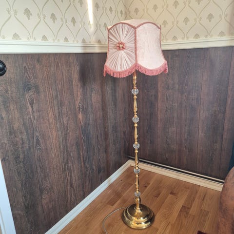 Golvlampa med två lampor brun plast. Lampan har en lång sladd och justerbara lampor för riktat ljus. Passar som belysning i rum där riktat ljus behövs. Lampa 132 cm hög