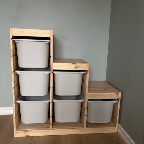 förvaringssystem bestående av trästomme med flera plastlådor i olika färger (röd, blå, beige, grön). Lådorna är av olika storlekar och systemet är anpassat för organiserad förvaring. 91 cm hög 94 cm breda.