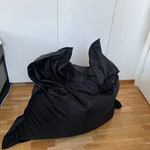 Två stycken stora Saccosäckar svarta. Ett litet hål i den ena (se bild)