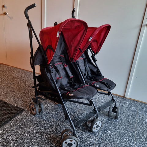 Superbra resevagn för två barn. Enkel att fälla ihop, sitt- och liggläge + kanonbra sufflett.