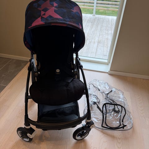 Bugaboo barnvagn i vinröd färg med svart chassi. Barnvagnen har en justerbar sufflett med mönster och en regnskyddsöverdrag i plast. Säkerhetsbälte med fempunktssele och mjukt handtag. Förvaringsnät under sittdelen. Passar för barn och är avsedd för daglig användning.