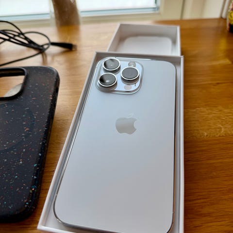 Apple iPhone 14 Pro mobiltelefon med 128 GB lagringskapacitet. Produkten visas med originalförpackning och tillbehör inklusive skyddsfodral.
