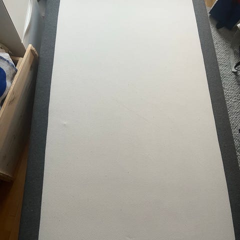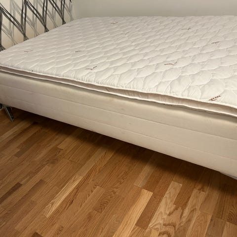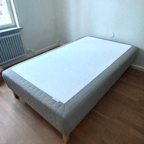 Jysk sängram tillverkad i trä med grått tygöverdrag. Sängramen har ribbotten och medföljande ben i trä. Passar för standardmadrasser och används som grund för sängar.