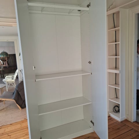 3st skåp, 6st hyllor, 5st korgar. Har använts som garderob och förvaringsskåp. Några märken finns på skåpen, se bilder