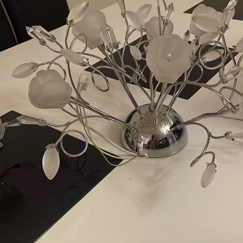 En taklampa med plats för två ljuskällor. Lampan har en metallkonstruktion med kedjor och vita lampskärmar. Bredden är 96 cm.